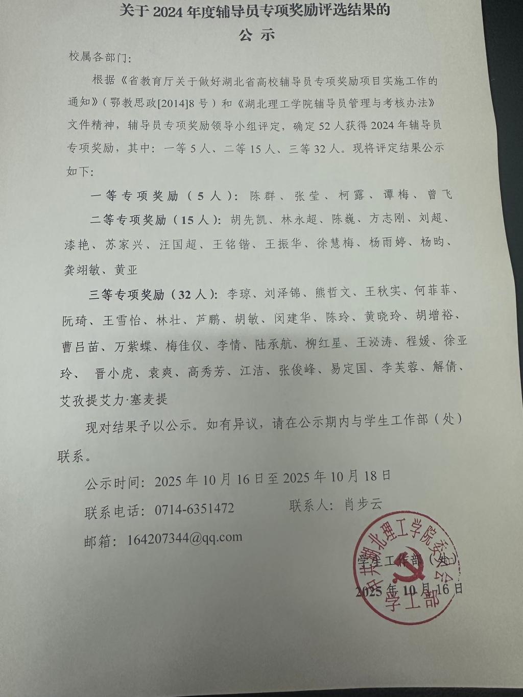 因夏仪2024年度工作不满一年,不符合辅导员专项奖励发放条件,医学院柳红星予以替补。