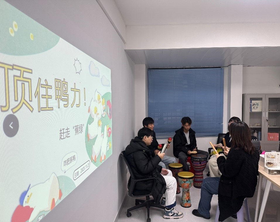 “敲响压力,释放自我”打击乐器互动环节将活动推向高潮。现场摆放了沙锤、铃鼓、梆子、手鼓等多种打击乐器,大家自由选择心仪的乐器,跟随音乐节奏释放情绪。音乐舒缓时,大家轻轻摇沙锤、敲手鼓,将备考的委屈与压抑缓缓倾诉;音乐激昂时,大家用力敲击梆子、甩动铃鼓,尽情宣泄出焦虑情绪。